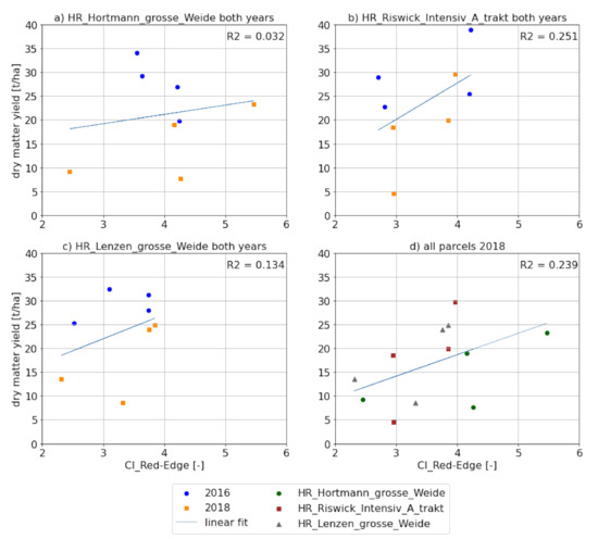 The last goal of this paper was to establish relationships between vegetation indices on the one hand and crop yield on the other hand, in order to evaluate whether vegetation indices could be a good predictor for grassland biomass content. These relationships are depicted in the scatterplots of Figure 8. Anticipating that dry matter content would increase proportional to the increase of the CIRed-Edge, positive trends were expected in the data. For most of the charts this was the case to some extent, since low to moderate R2 values were observed (Figure 8b–d), whereas the trend for the parcel Hortmann grosse Weide seemed to be rather weak (Figure 8a). Similar patterns were observed in the associations between dry matter yield and the other three calculated vegetation indices that were described in Section 2.2.