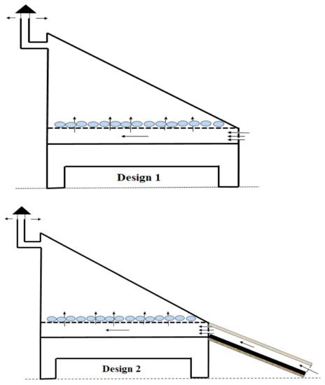 Figure 2. Schematic diagrams of the studied solar dryer without (design 1) and with (design2) a solar collector.