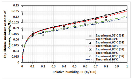 The sorption isotherm is very important in drying processes. It gives the equilibrium moisture content of the studied product at the given drying air relative humidity and temperature. The Guggenheim–Anderson–de Boer (GAB) model for equilibrium moisture content is highly recommended in the literature [37] because of its satisfactory results in all relative humidity ranges, allowing for a good approximation of the moisture content at the fiber saturation points. The performance of passive solar dryers is highly dependent on the constant periodic variations of the environmental conditions, and therefore it is important to have a continuous variation between the desorption isotherms and the drying air temperature as well as relative humidity. Thus, we used the GAB model to model the experimental data on desorption isotherms given by Ajala et al. [38]. The model obtained for the simulation is presented in Equation (1) with the parameters given in Table 2.