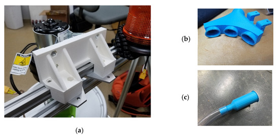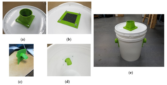 Several different parts were modeled and created via 3D printing because of their unique shapes and requirements, as shown in Figure 3. An outlet from the collection bucket was created to house a filter to prevent the blower from becoming clogged with cotton, as shown in Figure 3a,b. The inlets to the collection bucket were designed to divert the cotton to the bottom as shown in Figure 3c,d. Figure 3e shows the collection bucket with all the 3D printed parts.