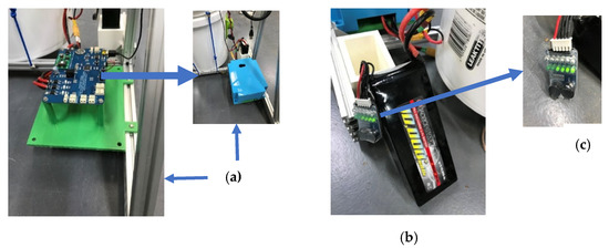 The controller circuit board to control the vacuum motor and blinker; (a) base and enclosure, (b) Lithium-Ion Polymer (LIPO) battery, and (c) low-power indicator.