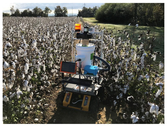 Robots are becoming more integrated into the manufacturing industry. Some examples of these integrations include material handling gantry robots [6], autonomous transport vehicles [7], automotive kitting applications [8], TIREBOT [9], and iRobot-Factory [10]. Robots are also applied in other industries (services, construction, mining, transportation/communication, agriculture/forestry/fishery), smart factories, smart buildings, smart homes, smart cities, and even on smart farms where it employs new paradigms and technologies like Industry 4.0, internet of things (IoT), cyber-physical systems (CPS), artificial intelligence (AI) and machine learning (ML). Zielinska (2019) [11] classified these industrial robots as those that operate under fully structured environments. However, field robots like those in the agriculture industry work in fully unstructured natural environments. Although it was more than three decades ago, Sistler (1987) [12] provided a review of the different robotic applications and their future possibilities in agriculture. More robot-based technologies have been used in agriculture. They have been implemented through the use of automation and with ranges of form factors, e.g., ground-based (e.g., smart tractors, unmanned ground vehicle [UGV]), crane-based systems, aerial-based (e.g., unmanned aerial vehicles [UAV]). A rapidly adopted automation in agriculture, for example, is an automated system for milking cows. Salfer et al. (2019) [13] estimated over 35,000 milking systems are currently used all over the world. For row crops, weed control with the rise of herbicide-resistant weeds and lack of new herbicide modes of action is a significant concern, and robotic systems are one of the proposed solutions [14]. For example, in the textile industry, growers of cotton (Gossypium spp.) aim for optimized fiber yield and quality [15]. The need for the textile industry and advances in robotics has led to the proliferation, and use of mobile robot platforms applied to the cotton industry. Several applications of robot platforms have been studied in cotton phenotyping [16,17,18]; lint yield prediction [19], path tracking [20,21], monitoring germination [22]; wireless tracking of cotton modules [23], yield prediction [24]; yield monitoring [25,26], and cotton residue collection [27]. Cotton growers who applied various technologies reported increased field performance and efficient use of resources [28].