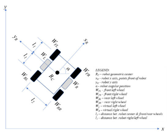 Autonomous field navigation is achieved by having a digital map of the field and localizing the robot on that map. Localization involves integrating the coordinate frame of the robot with the coordinate frame of the digital map. The robot’s coordinate frame, commonly referred to as its odometry, estimates the robot’s position and orientation over time. The accuracy of the robot’s odometry may be enhanced by integrating it with other positional readings from an IMU or a GPS device. The robot’s position is first determined using the kinematic model in Figure 7. The kinematic model of the four-wheeled robot used in this study was treated as a two-wheeled differential robot with virtual wheels WL and WR to simplify calculations. The robot’s current position is determined by a tuple (xc, yc, α) and its new position (xc, yc, α)’ after time δt, given its right and left virtual wheel linear speeds, vR and vL, respectively. The linear speed of each virtual wheel is shown in Equations (1) and (2).