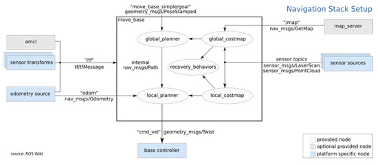 The ROS Navigation Stack is an integrated framework of individual software or algorithmic packages bundled together as nodes for steering the robot from one point to the next, as shown in Figure 8. Users configure the navigation stack by either plugging in built-in or custom-built packages in any of the navigation stack nodes. Estimation of the robot’s odometry is therefore handled internally by the nodes in the navigation stack that automatically loads, reference, and updates the configuration file during runtime execution of the robot.