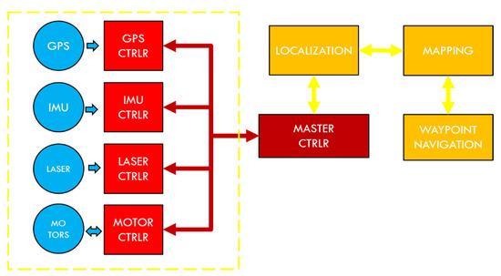 An overview of the hardware and software components needed for CHAP to navigate is shown in Figure 10. CHAP needs to know its location in a given map for it to navigate around it. To do this, it needs data readings from several sensors (GPS, IMU, and laser) for it to steer its wheel motors in the correct direction. Two essential tests (GPS accuracy and lidar precision) were conducted to configure and calibrate the hardware and software components and presented in Section 2.6.