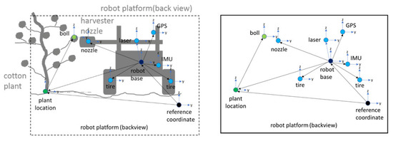 Relative positions of harvester nozzle versus cotton bolls with respect to robot base and plant location under a common reference coordinate.