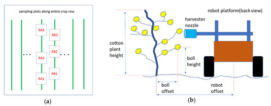 Cotton boll yield sampling based on Goodman et al. (2003) [38] was applied during the field tests. The yield estimate is based on the standard sample length of 3 m row. The bolls were then picked in the 3 m row and weighed to obtain better result. However, an assumption can be made about the weight of the bolls (~4 g) and so picking the number of bolls with the assumption that each boll weighs 4 g is sufficient to predict the yield. In our case, we were interested on how many bolls our suction system could harvest in a 3 m row. Note that since we only had one suction cap, the number of cotton bolls that could be harvested would be limited to that particular location. Two 3 m row (RA and RB) sampling locations were selected and then subdivided into three subplots. The subplots were labeled RA1 to RA3 and RB1 to RB3, as shown in Figure 12a. Each subplot had 10 consecutive cotton plants. The 3 m row was subdivided into subplots to account for the variabilities observed at the time of the measurements. Differences in plant height and cotton boll opening along the row were visually observed. To determine the position of the cotton bolls on each plant, measurements were made on the plant height, boll distance from stem (boll offset), and boll height above ground. These measurements were used to calibrate the position of the harvester nozzle targeting where most of the bolls are located as shown in Figure 12b. Measurements were all done two to three weeks after defoliation. The robot′s harvesting performance was evaluated by counting the number of cotton bolls that were harvested on the sampled rows.