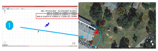 The onboard GPS accuracy was tested in seven sampling sites with varying field conditions and with the results are shown in Figure 13. The red markings inside the yellow circles are the GPS position readings for that sampling site. On average, a 0.6 m positional error for both easting and northing measurements was observed except for the first sampling site (blue markings). The GPS accuracy results showed more than half a meter average error on the longitude and latitude readings of the waypoints measured. This error is significant when the robot navigates in narrow rows. However, the issue was addressed by fusing the GPS, IMU, and odometry readings using filters.