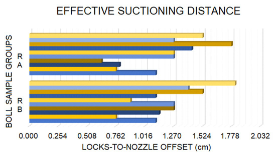 Most of the locks were suctioned-off the boll 1.27 cm away from the nozzle for the developed suction system. Figure 16 shows the average offset distance of 12 mm and 11.6 mm for rows A and B, respectively. Results indicate that the developed harvester does not have enough vacuum power to suction the entire boll; however, it is strong enough to suction the locks on each boll. Typically, only one lock is suctioned from each boll. In some instances, two locks were suctioned when both locks were close to the nozzle.