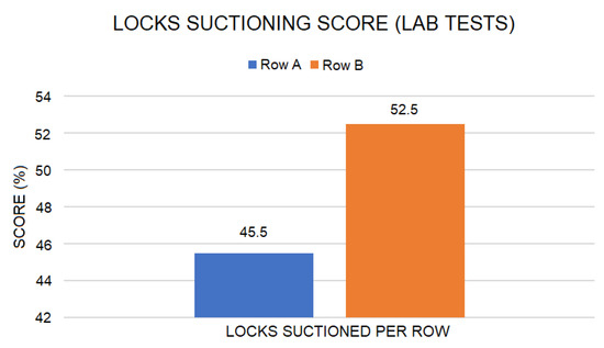 Figure 17 shows that Row B performed better with 52.5% of the locks suctioned than 45.5% of Row A. Averaging both performances resulted in 49% harvesting performance in the lab test conducted. Locks on Row A were observed to have more partially opened (immature bolls) compared to those of Row B, where most bolls were fully opened (matured). The partially opened bolls grip the locks more inside the bur, making it difficult for the harvester to suction.