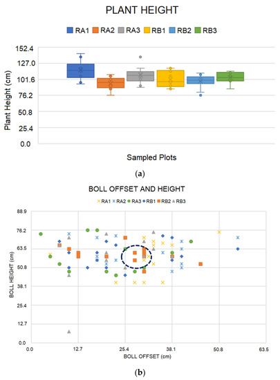 Results show that the average plant height in all subplots was 103.9 ± 11.9 cm, as shown in Figure 18a. The average boll offset was 26.4 ± 11.5 cm, and boll height was 59.5 ± 10.4 cm as shown in Figure 18b. The boll offset and boll height results indicated the region where most of the bolls are located and where the nozzle should be positioned. However, due to design constraints, the nozzle could only be adjusted vertically 45.7~68.6 cm in the vertical direction. We observed that there were approximately 4.5 bolls per subplot on an average per plant in this adjustment range. With 30 plants per row, a total of 135 bolls were possibly harvestable.