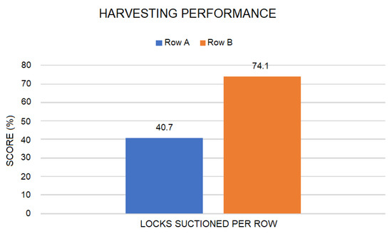 Out of 135 bolls, approximately 20% of them are in the nozzle’s linear movement′s direct path as it passes the plants. Hence, 27 bolls were expected to be harvested per row. However, based on the lab test conducted, the harvester′s current configuration only allowed one lock per boll to be suctioned. Therefore, 27 locks were expected instead of 27 bolls. Results showed that Row A had 11 locks (40.7%), and Row B 20 locks (74.1%) harvested in total as shown in Figure 19. The average weight of each lock was 765 and 850 mg for Rows A and B, respectively. More locks per boll were harvested in Row B since in this row the plants have more fully opened/mature bolls compared to Row A. The field tests results agreed with the results conducted in the lab tests where Row B performed better.