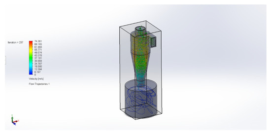 The original inspiration for a collection device for the cotton bolls was that of a cyclone separator. This device uses centripetal force to convert a linear stream of air to a rotational one. Thus, suspended particles move to the outside of the cyclone, where the boundary flow layer helps the particles drop down out of the cyclone into a collection device. As a proof-of-concept, a preliminary fluid simulation was performed on a separator sized to fit the robot, the results of which are shown in Figure 20. The simulation was performed using the computational fluid dynamics (CFD) package SolidWorks 2017 Flow Simulation add-in. Two boundary conditions and the geometry of the separator defined the simulation. The inlet port pressure boundary condition was at atmospheric pressure. The outlet port boundary condition was set to a flow volume of 250 CFM, which is the blower’s rated flow volume. This flow volume is an ideal case since the separator will add static pressure resistance, decreasing the flow volume. The blower′s pump curve was unknown, so the flow was taken to be an ideal 250 CFM. Using these conditions, the CFD add-in can solve the Navier–Stokes equations to estimate fluid velocity and pressure inside of the 3D model [39]. The average velocity was found to be 16.5 m/s with an assumed wall roughness of 100 μM.