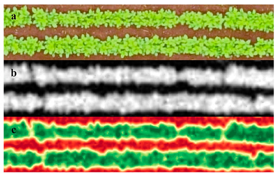 (a) Original image of an experimental plot. (b) Triangular greenness index image of an experimental plot. (c) Triangular greenness index image with red–green palette applied.