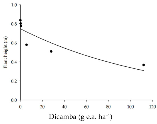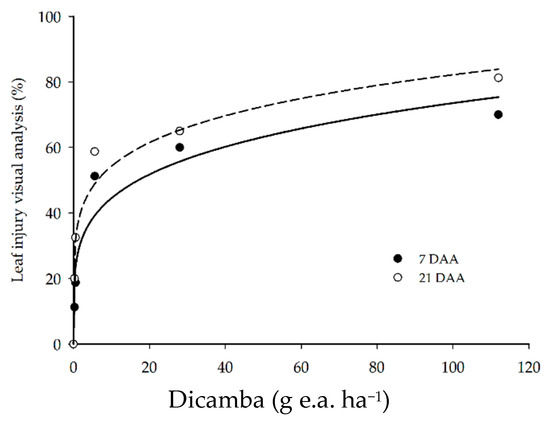 Dicamba is a systemic herbicide, absorbed and translocated to growth points in the plant. The phytotoxic symptoms usually arise at approximately 7 DAA and tend to increase up to 21 to 28 DAA [26,27]. The main symptoms observed were the curling and wrinkling of younger leaves. At higher doses, reductions in plant height were found, and, at the highest dose (112 g e.a. ha−1), stem twist and death of the apical meristem were observed.