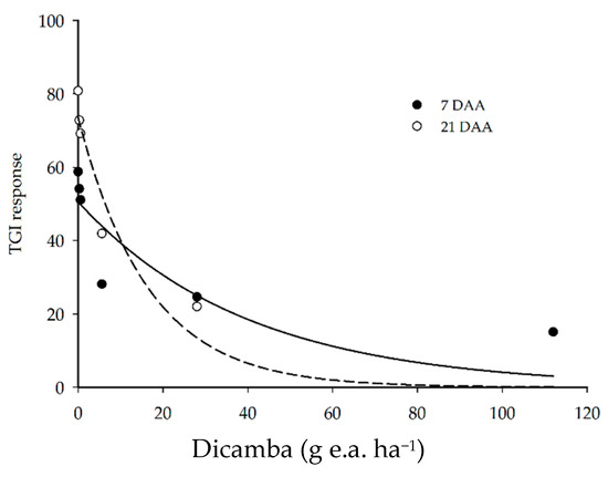 On the other hand, the application of up to 5.6 g e.a. ha−1 of dicamba at 21 DAA generated higher TGI values, as compared to 7 DAA, indicating plant development and recovery from the injury caused by the herbicide. The application of 28 and 112 g e.a. ha−1 of dicamba at 21 DAA further decreased the TGI responses, with reductions of 73 and 110% as compared to the control (0 g e.a. ha−1 of dicamba), respectively.