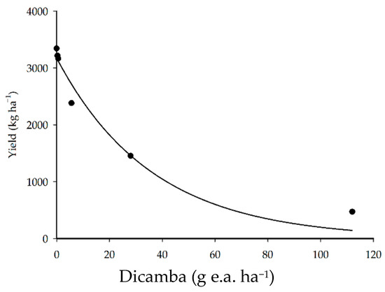 Nonlinear regression models were adjusted for the effects of dicamba doses on all variables and assessment periods (Table 2). The visual analysis (7 and 21 DAA) fitted in a model of power regression, while TGI (7 and 21 DAA), plant height, and yield fitted in a model of exponential regression. The best model adjustments (R2 > 90.0) were obtained for visual analysis (7 and 21 DAA), TGI (21 DAA), and yield.