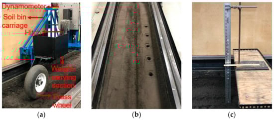 (a) Press-wheel, test apparatus and soil bin; (b) Soil sinkage resulting from the press-wheel and collection of soil bulk density samples; (c) Measurement of soil surface elevation before and after a test run.