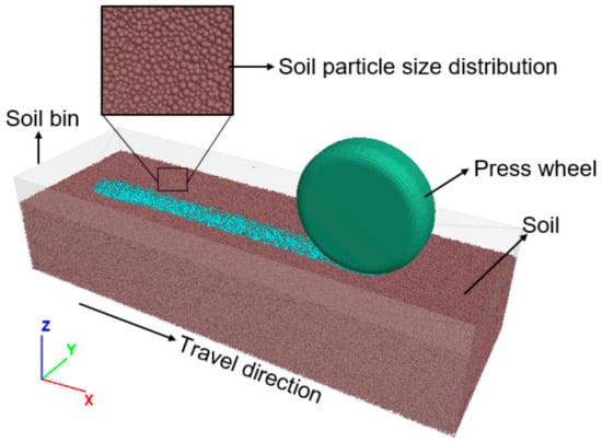 A soil–wheel interaction model was developed using PFC3D. The model components included model soil particles and a model press-wheel that traveled on the surface of the model soil, as described in the following sections.