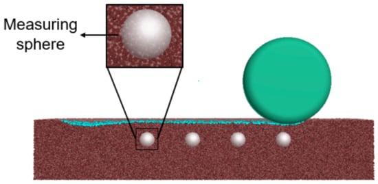 In the PFC3D environment, objects known as measurement spheres were used to determine stresses between soil particles in all directions at a specified region within the model soil. Four of these measurement spheres, with a diameter of 0.10 m, were used to monitor the soil stresses in the model. The measurement spheres were equally spaced and placed 0.12 m underneath the soil surface and travel path of the press-wheel (Figure 3). The centre of the measurement sphere was placed at the 0.12 m depth. Lamandé and Schjønning [21] used a similar depth in determining ground stresses in the top soil layer when observing the effect of wheel load at the soil-tyre interface. The instantaneous stresses between soil particles were monitored within the measurement spheres at the specified depth as the press-wheel travelled along the soil box. These measured stresses provided an insight into how far and wide the press-wheel affected the soil particle dynamics.