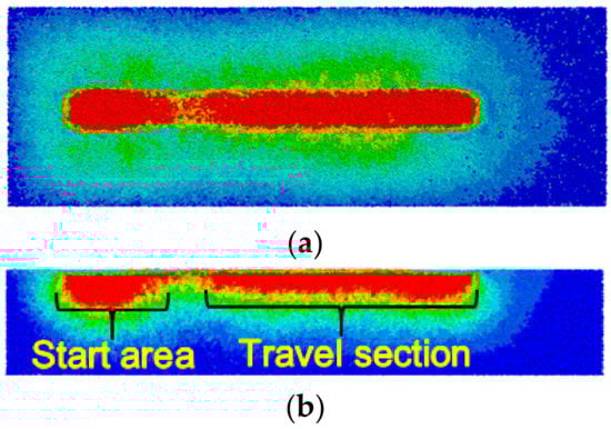 Similar to the observation in the soil bin experiment, soil deformation occurred along the travel path of the soil-wheel interaction model (Figure 4a). The red-coloured contour and green-coloured contour indicated the highly displaced soil particles and fairly displaced soil particles, respectively. The blue-coloured contour indicated the non-displaced soil particles. It should be noted that, at the start of the simulation, soil particles displaced more downwards, as compared to the rest of the travel path (Figure 4b). This was attributed to the fact that, when the press-wheel impacted the soil surface, it produced a force far greater than its own weight, which made the particles beneath it move vigorously downwards until equilibrium of the forces was achieved between the press-wheel and the soil surface. Beyond that area, the dynamic attributes in all directions between the press-wheel and soil surface were fairly constant throughout the rest of the travel path. Sinkage and other variables were monitored within this stable section, which was approximately 1.4 m. The simulated sinkage was determined as the difference between the final position of the wheel base contacting the soil surface and the level of the initial soil surface. The average of the sinkage values over the stable section was presented.