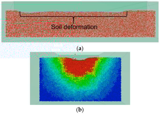 The soil particles beneath the press-wheel in the soil–press-wheel interaction model were observed to move in a peculiar manner. This peculiar flow behaviour can be described or characterized into two regions (Figure 11a). The first region consisted of a forward region, where the soil particles flow or move in an anticlockwise direction. This was possible due to the contact force generated by the press-wheel to push particles forward and outwards creating a “bulldozing” phenomenon. The second region consisted of a rear region, where the soil particles flow or move in a clockwise direction. This can be described as a “digging” phenomenon, where the soil particles are moved outwards by the press-wheel. However, the area between the forward and rear regions had soil particles moved downwards. This was evident in the soil displacement contour (Figure 4). This flow distribution of soil particles was also observed by Zhao and Zang [26] when simulating tire–sand interaction using FEM/DEM applied models. During the passage of the press-wheel, soil particles (red) located 0.13 m directly beneath the surface had the highest velocity (0.09 m/s). The particles (green) with the least velocity recorded a value of 0.04 m/s at a depth of 0.25 m beneath the soil surface (Figure 11a). From the top view, the press-wheel affected soil particles (red) in a diameter of 0.27 m. The least affected soil particles (green) had a diameter of 0.49 m (Figure 11b).