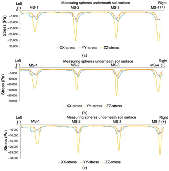 Under the same press-wheel width (0.122 m), the simulated relationship between soil stress and sinkage were quite similar among the three moisture content levels. Generally, as the press-wheel ran above the measuring sphere, the soil stress in the sphere increased, and the sinkage caused by the press-wheel also increased from the initial edge to the opposite edge of the measuring sphere but levelled off thereafter. This was quite apparent in the soil with low and high moisture content levels (Figure 7a,c). The soil with medium moisture content showed a steadily increasing trend for the stress–sinkage relationship (Figure 7b). Moreover, there was evidence of a linear trend across the three soil moisture content levels for each press-wheel width (Figure 7d–i). As compared with the other press-wheel widths, higher pressure values were recorded for the 0.055 m press-wheel width across the three soil moisture content levels. This could be attributed to its smaller surface area and, therefore, leading to higher pressure generated on the surface. As soon as the press-wheel moves away from the location of interest (MS-1), the sinkage readings levelled off and remained fairly constant throughout the travel section of the soil bin.
