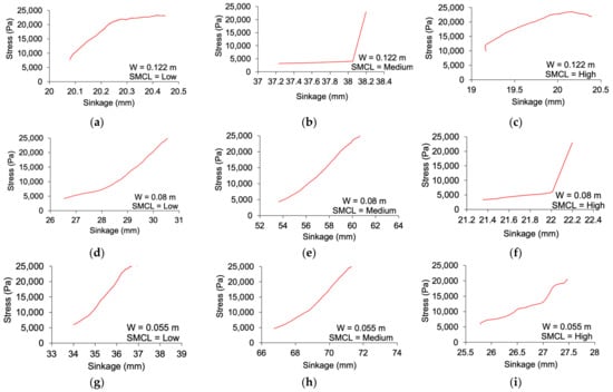 Press-wheel width (W) effects on the stress–sinkage relationship for the three soil moisture content levels (SMCL) using data from first measuring sphere (MS-1): (a–c) Stress-sinkage relationship for 0.122 m press-wheel width across three soil moisture content levels; (d–f) Stress-sinkage relationship for 0.08 m press-wheel width across three soil moisture content levels; (g–i) Stress-sinkage relationship for 0.055 m press-wheel width across three soil moisture content levels.