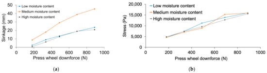 (a) Sinkage results for different down forces of press-wheel under different soil moisture levels; (b) soil stress versus press-wheel down forces under different soil moisture levels.