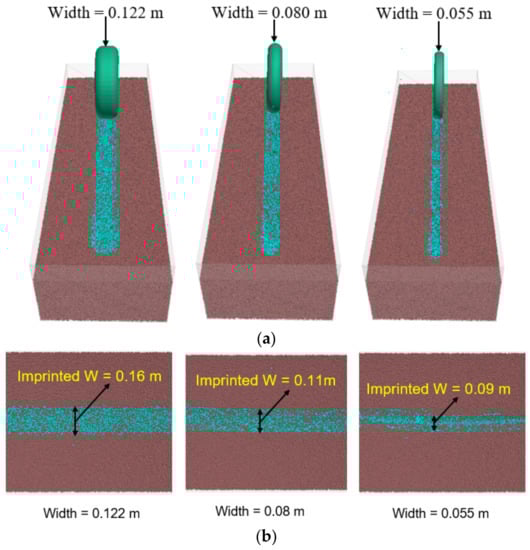 (a) Simulation of press-wheel under different widths (W); (b) imprinted widths for 0.122 m, 0.08 m and 0.055 m press-wheels after passage on soil with medium moisture content level.