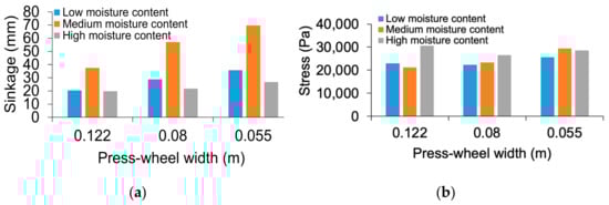 (a) Sinkage results for different press-wheel widths under different soil moisture levels; (b) soil stress versus press-wheel widths under different soil moisture levels.