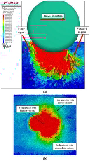 (a) Velocity flow distribution of soil particles during passage of press-wheel; (b) magnitude of velocity for soil particles directly beneath the press-wheel during passage (top view of model).