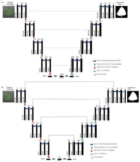 Architecture of (A) original U-Net and (B) modified U-Net.