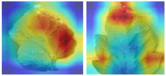 The development of visualization techniques has resulted from an increased interest in the internal mechanisms of CNNs and the logic behind a network making particular decisions. The visualization techniques aid in the interpretation of CNN decision-making processes by providing a more visual representation. This also improves the model’s clarity by visualizing the reasoning behind the inference in a way that is readily understood by humans, thus raising trust in the neural network’s outcomes. Among the numerous visualization techniques available, such as SmoothGrad [], Grad-CAM [], Grad-CAM++ [], and Score-CAM [], the recently proposed Score-CAM was used in this study due to its promising output. The weight of each activation map is obtained through its forward passing score on the target class, and the final result is obtained through a linear combination of weights and activation maps. Score-CAM eliminates the dependency on gradients by obtaining the weight of each activation map through its forward passing score on the target class. Figure 2 shows a sample image visualization with Score-CAM, with the heat map showing that the leaf regions controlled the decision making in CNN. This can help users understand how the network makes decisions and can also raise end-user trust if it can be verified that the network always makes decisions based on the leaf area.