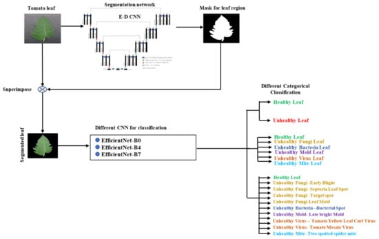 In this work, we developed a deep convolutional neural network (CNN) based on a recently developed EfficientNet CNN model. The model was fine-tuned and trained for the detection of healthy and different unhealthy tomato leaf images. The obtained results show that our model outperforms some recent deep learning techniques by using the most popular publicly available Plant Village dataset [,]. It was also found that the Modified U-net was best suited for segmentation of leaf images from the background and EfficientNet-B7 was better at extracting discriminative features from images compared to other architecture. Besides, the performance of the networks generally further improved when trained with more parameters. The trained models can be used in the early automatic detection of plant diseases. Experts need years of training and knowledge to early disease detection with visual inspection but our model can be used by anybody who is not an expert. Any new users will have the network working in the background which will take input from the visual camera and immediately inform the user of the output so that the user can take necessary action. Thus, preventive actions can be taken earlier. This work can be beneficial in early and automatic disease detection of tomato crops enabled by the latest technologies such as smartphones, drone cameras, and robotic platforms. The proposed framework can be incorporated with a feedback system that gives valuable suggestions, remedies, disease management, and control strategies, thus ensuring better crop yields. The authors would work on an extension of the work to validate the performance of the proposed solution on a real-time application where microcontrollers with cameras will be used to check the performance. The future work would have a much more diverse environment and the authors are confident that it will work better even over there.