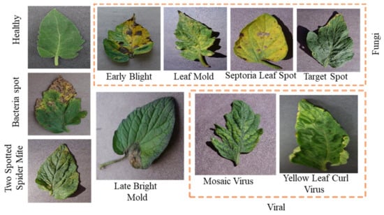 The most common plant pathogens are fungi, which can cause a variety of diseases such as early blight, septoria leaf spot, target spot, and leaf mold. Fungi can invade plants from a variety of places, including infected soil and seeds. Animals, humans, equipment, and soil pollution may all spread fungal infections from one plant to another. The fungus that causes early blight disease in tomato plants affects the plant leaves. Collar rot, stem lesion, and fruit rot are the terms for the rot that affects the seedlings’ basal stems, adult plant stems, and fruits, respectively [,]. The most important methods for controlling early blight are cultural control, which involves effective soil, nutrient, and crop management, as well as the use of fungicidal chemicals. Fungus induces Septoria leaf spot on tomato plants [,], which releases tomatinase enzyme, which speeds up the degradation of tomato steroidal glycoalkaloids α-tomatine [,]. The fungus induces the target spot disease in tomato plants [,]. In tomato plants, necrotic lesions with a light brown color in the middle are symptoms of target spot disease [,]. Early defoliation occurs when the lesions spread to a wider blighted leaf region [,]. The goal spot also does direct damage to the fruit by penetrating the pulp [,]. The fungus is responsible for plant leaf mold disease [,], which happens when the leaves are damp for a long time. Bacteria are a major plant pathogen as well. They get into plants through wounds like insect bites, pruning, and cuts, as well as natural openings like stomata. Temperature, humidity, soil conditions, nutrient availability, weather conditions, and airflow are all important factors in bacterial growth on plants and the harm they cause. Bacterial spot is a bacterial-caused plant disease [,]. Molds are also a significant contributor to plant disease. Mold causes late blight disease in tomato and potato plants [,]. A few of the symptoms include the presence of dark uneven blemishes on leaf tips and plant stems. The Tomato Yellow Leaf Cur Virus (TYLCV) is a disease-causing virus that affects tomatoes. The plant is infected by this virus, which is spread by another insect. Despite the fact that tomato plants have diseased leaves and a ten-class classification. Different types of tomato leaf diseases were categorized into disease categories in study 2, while different classes of unhealthy and stable leaf photos were classified in study 3. Similar studies have shown that the virus can infect a number of plants, including beans and peppers, tobacco, potatoes, and eggplants [,]. Owing to the disease’s rapid spread in recent decades, the focus of research has changed to damage control of yellow leaf curl disease [,,,]. Tomato mosaic virus is another viral disease that directly affects tomato plants (ToMV). This virus is present all over the world and affects not only tomatoes but also other plants. Twisted and fern-like stems, infected fruit with yellow patches, and necrotic blemishes are all symptoms of ToMV infection [,].