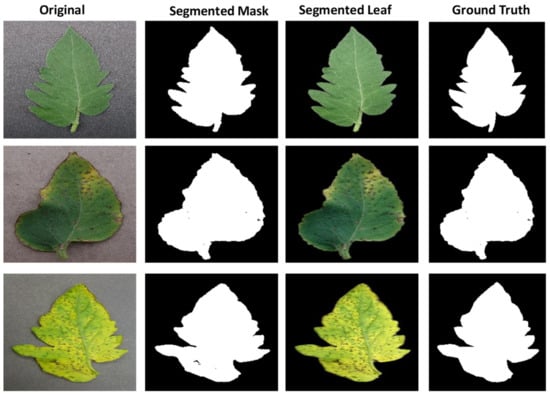 In this study, three different segmentation models, the original U-net [], and modified U-net [] were trained, validated, and tested for the segmentation of tomato leaf images. Table 6 shows the comparative performance of the two segmentation models using three different loss functions (namely, NLL, BCE, and MSE loss function) in image segmentation. It can be noted that the Modified U-net with NLL loss function outperformed the original U-net in the segmentation of the leaf region on the whole images quantitatively and qualitatively. The test loss, test accuracy, IoU, and dice for the segmentation of tomato leaves using Modified U-net with NLL loss function were found to be 0.0076, 98.66, 98.5, and 98.73, respectively. Figure 5 shows some example test tomato leaf images, corresponding ground truth masks, and segmented leaf images generated by the Modified U-net model with NLL loss function for the Plant Village dataset.