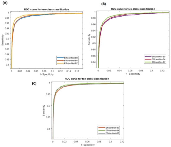 For segmented tomato leaf images, EfficientNet-B7 outperforms others and for two-class and six-class problems showed accuracy, sensitivity, and specificity of 99.95%, 99.95%, 99.77%, and 99.12%, 99.11%, 99.81%, respectively. In contrast, EfficientNet-B4 produced the best result for ten-class with accuracy, sensitivity, and specificity of 99.89%, 99.44%, and 99.94%, respectively. It is evident from Figure 5 that network performances are slightly improved with more parameters for 2-class, 6-class, and 10-class problems.Figure 6 clearly shows that the Receiver operating characteristic (ROC) curves for two-class, six-class, and ten-class problems using segmented tomato leaf images. However, deep networks can provide better performance gain for 2-class and 6-class problems.