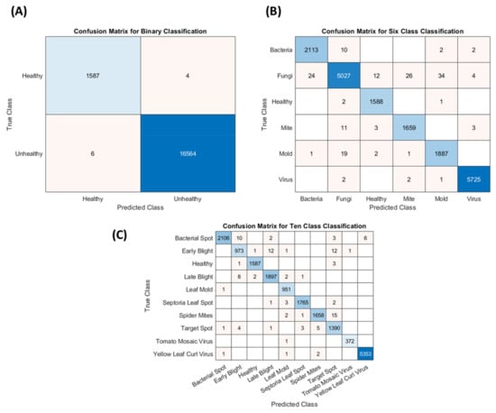 The confusion matrix for the best performing networks for the different classification problems using tomato leaf images is shown in Figure 7. It can be noticed that even with the best performing network EfficientNet-B7 for two-class tomato leaf images, 6 out of 16,570 unhealthy tomato leaf images were misclassified as healthy and 4 out of 1591 healthy tomato leaf images were miss-classified as unhealthy images.
