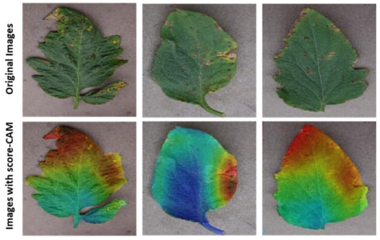 Score-CAM visualization of tomato leaf images, to show where the CNN model is mainly taking the decision.