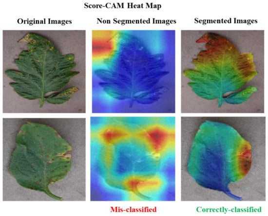 In this study, the reliability of the trained networks was investigated using visualization techniques. Score-CAM- of five different categories were misclassified as healthy or any other unhealthy classes. For the ten-class problem, heat maps for segmented tomato leaf images were used. Figure 8 shows the original tomato leaf samples along with the heat maps on segmented leaves. As can be seen from Figure 8, the networks are learning from the leaf images in the segmented leaf, which makes the network decision more reliable. This helps to counter the criticism that CNN takes decision from the non-relevant region and are not reliable []. It can also be seen in Figure 9 that segmentation has helped in a classification where the network learns from the region of interest. This reliable learning has helped incorrect classification. In addition, the authors have also experimented to confirm that segmentation helps in learning and taking decisions from relevant areas compared to non-segmented images (see Supplementary Figure S1).
