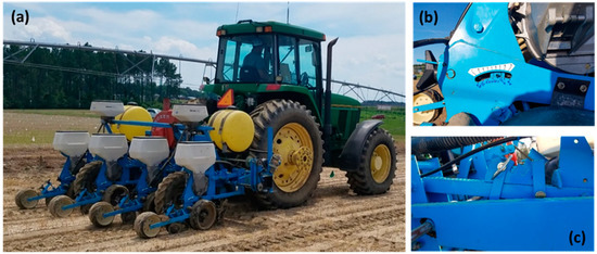 In all studies, cotton was planted using a four-row Monosem NGPlus vacuum precision planter (Monosem Inc., Edwardsville, KS, USA) shown in Figure 1a. The planter was equipped with a mechanically driven seed meter and a mechanical downforce control system equipped with heavy-duty springs for applying additional force on each individual row-unit. The seed depth setting on each row-unit was controlled by turning the knob, which positioned the gauge wheel stop to attain the predetermined seeding depth (Figure 1b). A depth positioning guide and label, adjacent to the knob, were also provided on each row-unit to attain different seeding depths. Seeding depths up to 8.9 cm can be attained on this planter by adjusting the gauge wheel stop position. Downforce adjustments were made by positioning and securing the lateral arm (attached to the heavy springs) in four different positions (Figure 1c), which changed the spring tension, thus varying the amount of load applied on the gauge wheels. The four positions of the spring-loaded arm corresponded to approximately 445, 890, 1335 and 1780 N of applied force on each row-unit, whereas disengaging the arm resulted in no additional load on the row-unit other than the row-unit weight plus the weight of any seed and product in the hopper. Cotton was planted at a seeding rate of 105,020 seeds ha−1 during all three years.
