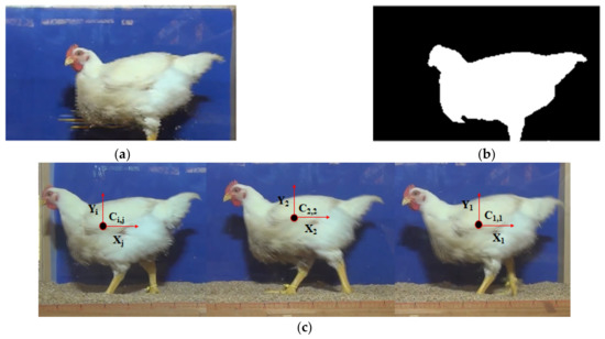 Original (a) and segmented (b) images of the broiler walking the defined path to assess the gait score and the displacement of the center of mass (c). Ci,j is the center of mass in the frame i,j.