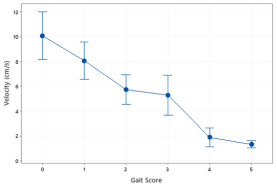 The average walking velocity (cm/s) observed differences in the broiler footage with different known gait scores.