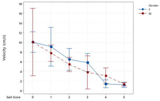 The gait score did not differ between males and females (ANOVA, p > 0.05), with both genders presenting a decrease in gait speed as the GS increased (Figure 4).
