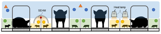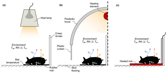 Modern swine farrowing facilities have unique environmental control design constraints; the system must simultaneously achieve the thermal needs of the mature sows and newborn piglets. This set of thermal needs conflict with each other as the air temperature defining the thermoneutral zone for farrowing/lactating sows is approximately 18 °C [1,2] and for piglets is approximately between 32 °C to 35 °C [3]. The widely adopted solution has been to create two distinct thermal environments in the room [1,4]. The room macroenvironment is targeted to meet the cooler thermal needs of the sows, via increased ventilation exchange rate and decreasing air temperature with evaporative cooling pads. A localized microclimate via supplemental heat sources is provided in the farrowing stall creep area to achieve the warmer needs of the piglets. The swine industry uses several different supplemental heat sources including heat lamps (infrared bulb ranging from 125 to 250 W), heat mats (electric heaters encapsulated in plastic), semi-enclosed heated microclimates (parabolic shield with an infrared heat source for two creep areas), and brooders (totally enclosed area with a heat lamp) [1,5,6,7]. This cost-effective approach (both capital cost and energy usage) is capable of meeting both the thermal needs of sows and piglets; however, the diversity in macro- and micro-climates results in variable thermal conditions for the piglets, which could result in reduced piglet growth and increased pre-wean mortality (PWM) rates [2,8]. The creation and control of the microclimate is an excellent use case for precision livestock farming technology (PLF) as a model-based control system can be developed and deployed [9].