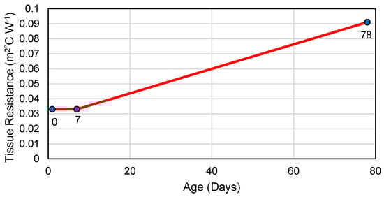 A tissue resistance curve was developed based on assumptions related to the piglet’s development of thermoregulatory capabilities due to the lack of data in the literature for piglet values. Tissue resistance values were fixed from birth to 7 days of age, as done in similar thermal balance models [4]. The tissue resistance from day 8 to 30 was determined using a linear regression of published values. Birth to 7 days of age values were obtained from Hoff et al. [4]. The maximum tissue resistance of a 50 kg pig and an assumed age (78 days) at 50 kg for PIC genetics was used as the high tissue resistance point in the age versus tissue resistance regression (Figure 2; 78 days; [31,32]). A linear regression of age (x-axis) and tissue resistance (y-axis) was used to determine the tissue resistance of the piglet between 7 and 30 days of age. This assumes that the piglet is of average weight and in good health. This approach was utilized as to use previous research reporting tissue resistance values at a given weight of a piglet and a nursery pig. Current data are lacking in tissue resistance values to better utilize current growth cures that are non-linear.