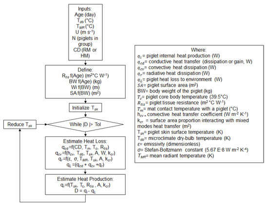 The steady-state thermal balance model, built into a custom software (Python 3.7, Python Software Foundation, Wilmington, DE, USA) using an integrated development platform [33]. The model started with key inputs of age and thermal environment parameters. The age dependent inputs of piglet dimensions were calculated, followed by the SA for the piglet and the number of piglets in the group (Equation (8); Figure 3). The model iterated Tsk until the core to skin heat transfer was balanced by skin to ambient, which included the conductive, convective, and radiative heat transfer. A tolerance of 0.5 mW was used as the tolerance in the absolute difference for convergence of the model.