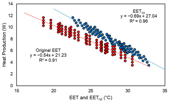 Addition of conductive heat transfer into EETcp allows for a more accurate evaluation of the creep area microclimate. Figure 5 depicts the comparison of EET [21] and EETcp for the simulated condition of a single piglet at 1 day of age on a rubber mat. The original EET fails to characterize the thermal environment when considering the conduction to the mat. The different intercepts and slopes of the two regressions is attributed to the EETcp more accurately depicting the piglet’s interaction with the environment through the inclusion of conduction and allocating different values of SA to the convection and radiation components. The shift in EETcp warranted the reclassification of the ideal thermoneutral range that was derived from previous literature.