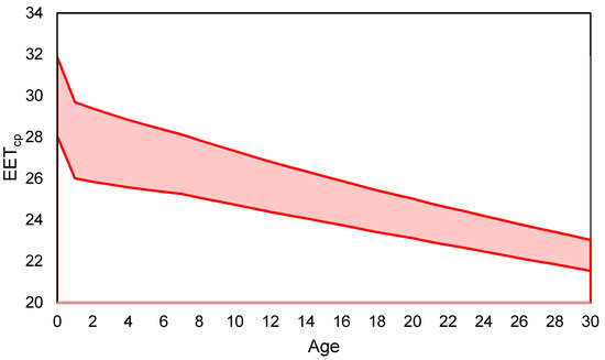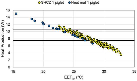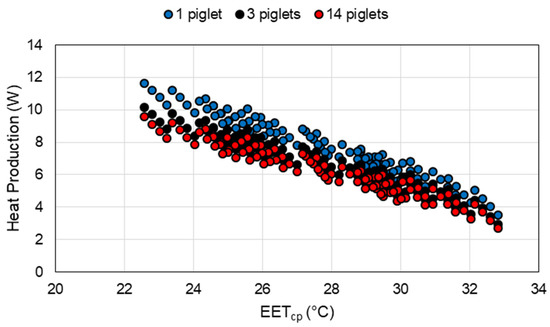 The THP was calculated as a function of BW (Equation (9)) for piglet BWs ranging from birth to weaning (28 days old) using the commercial genetics’ line growth curve ([27], PIC personal communication, 2020). This approach produced THP results similar to previous studies [18,41]. To determine the piglet’s heat production associated with the piglet’s thermoneutral zone, results from [41] were used as it was reported that piglets preferred an environment that allowed for 7.5 to 10.5 W of piglet heat production. Using this range and the predicted heat production of 9 W for a 1.5 kg piglet, a range of ±1.5 W was determined. The ideal EETcp was determined using the minimum and maximum thermoneutral piglet heat production values and the linear regressions fit from the model data.